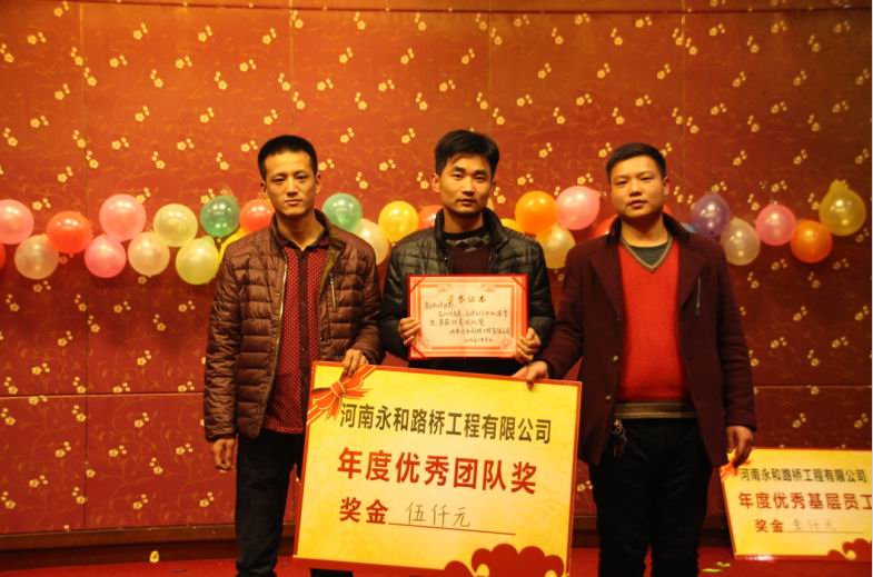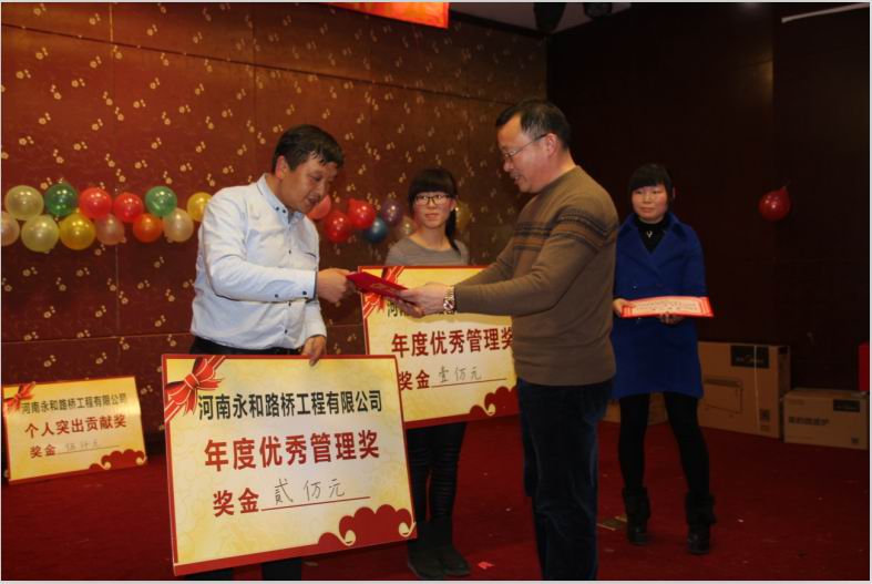 2016年2月4日晚,農(nóng)歷臘月26日晚,河南永和路橋工程有限公司在信陽(yáng)市五星 級(jí)酒店中樂(lè)百花酒店隆重的舉行了2016年新春團(tuán)拜會(huì),本次團(tuán)拜會(huì)由公司全體員工及家屬、公司的合作伙伴、朋友等共同出席,大家歡聚一堂、把酒言歡、其樂(lè)融融。公司董事長(zhǎng)孔總發(fā)表新年賀詞比代表公司對(duì)年度優(yōu) 秀個(gè)人及團(tuán)隊(duì)進(jìn)行了表彰。公司還為到場(chǎng)的每位小寶寶送上新年祝福和紅包,并準(zhǔn)備了抽獎(jiǎng)環(huán)節(jié)。大家歡歌笑語(yǔ),一直將熱鬧、愉快的氛圍維持到午夜。圖為團(tuán)拜會(huì)期間頒獎(jiǎng)儀式